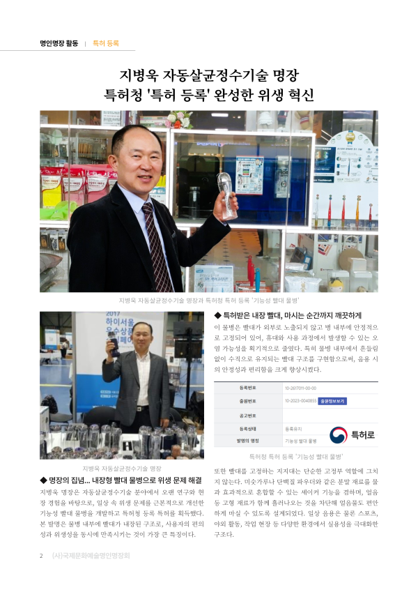 기능성 빨대 물병 / 자동 살균기능 휴대용 물병 자동 살균 필터샤워기 / 살균기능 필터 샤워기 특허증