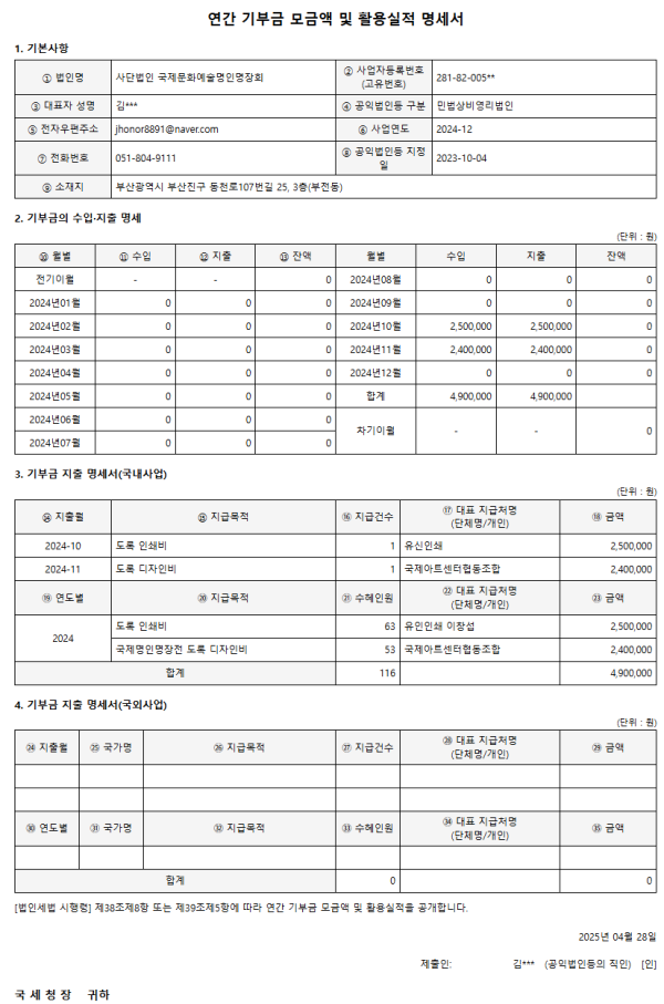2024 기부금 활용실적 명세서 페이지 정보 작성자 관리자 댓글 0건 조회 49회 작성일 25-12-19 15:01 목록 답변 글쓰기 본문 기부금모금 및 활용실적 국민의 알권리를 보장하고 운영의 투명성을 확보하기 위하여 정보공개제도를 시행하고 있습니다. 다음글2023 기부금 활용실적 명세서 25.12.19 댓글 0 댓글목록 등록된 댓글이 없습니다.