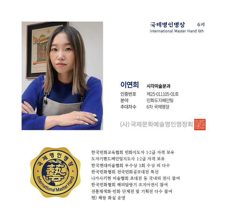 She holds Level 1 and 2 qualifications as a Minhwa Instructor from the Korea Minhwa Education Association and as a Ceramic Hand Painting Instructor.