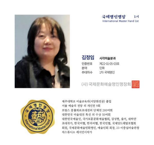 In addition to winning a Special Award at the Unification Culture Festival, she serves as a Recommended Artist for the International Comprehensive Arts Exhibition and a member of the International Comprehensive Arts Promotion Council.