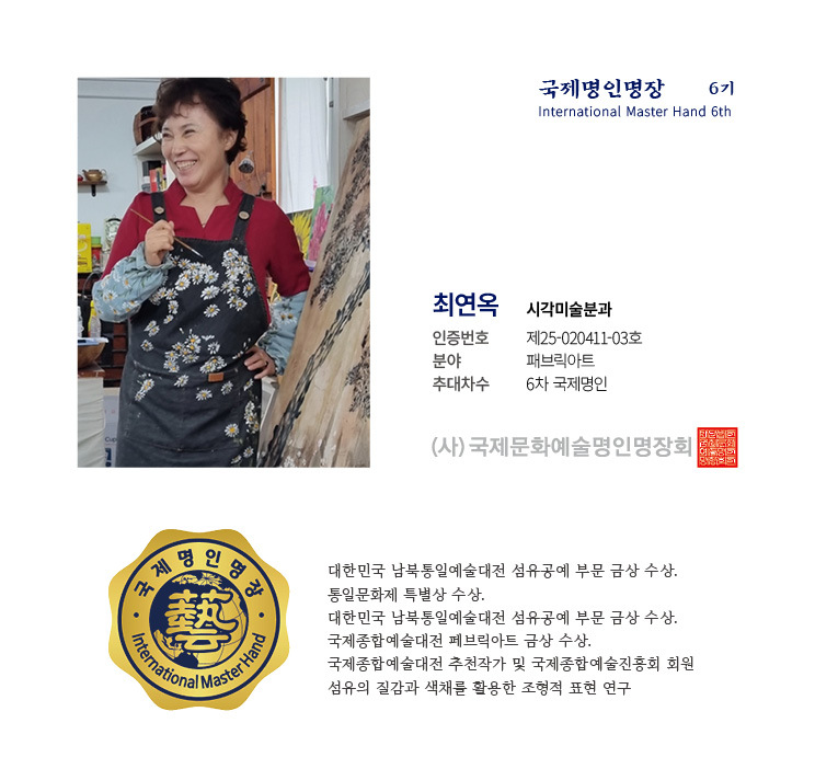 She received the Gold Award in the Textile Crafts section at the Republic of Korea North-South Unification Art Exhibition and the Gold Award in Fabric Art at the International Comprehensive Arts Exhibition.