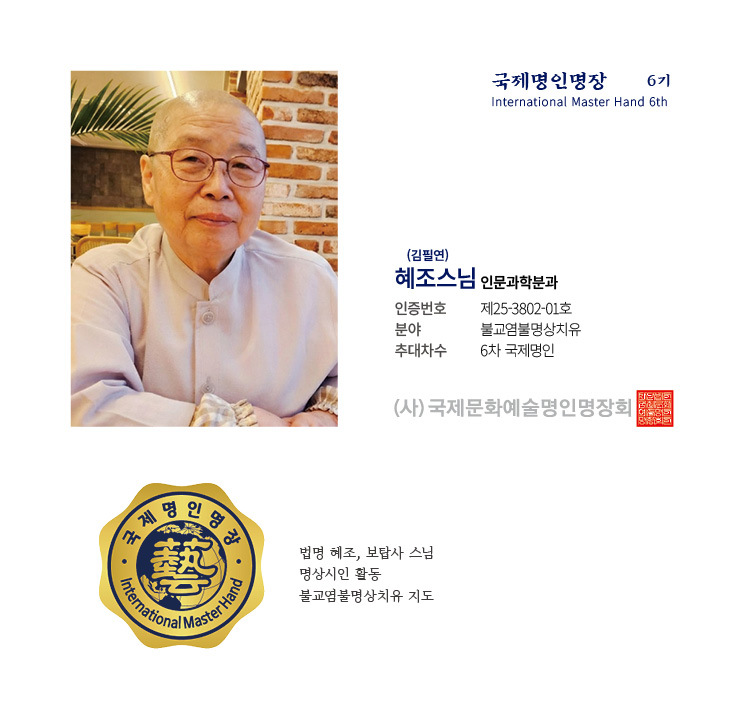 Serving as a monk at Botapsa Temple under the Dharma name Hyejo, she is active as a meditation poet. She provides instruction and guidance in Buddhist chanting meditation healing.
