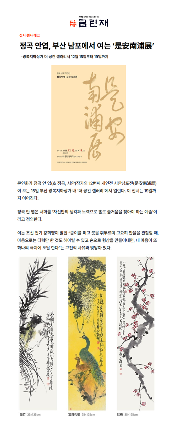 [금린재뉴스] 정곡 안엽, 부산 남포에서 여는 ‘是安南浦展’