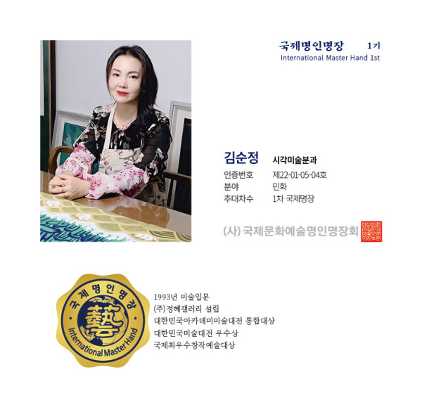 Currently operating Haerang Art Studio, she received the Excellence Award three times from the Korea Contemporary Art Association and a Special Selection at the National Minhwa Competition.