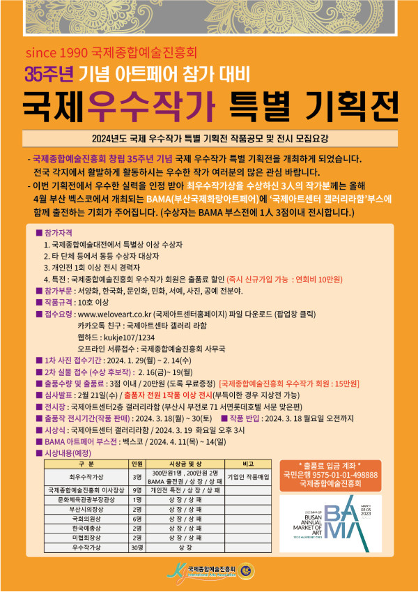 - 국제종합예술진흥회 창립 35주년 기념 국제 우수작가 특별 기획전을 개최하게 되었습니다.